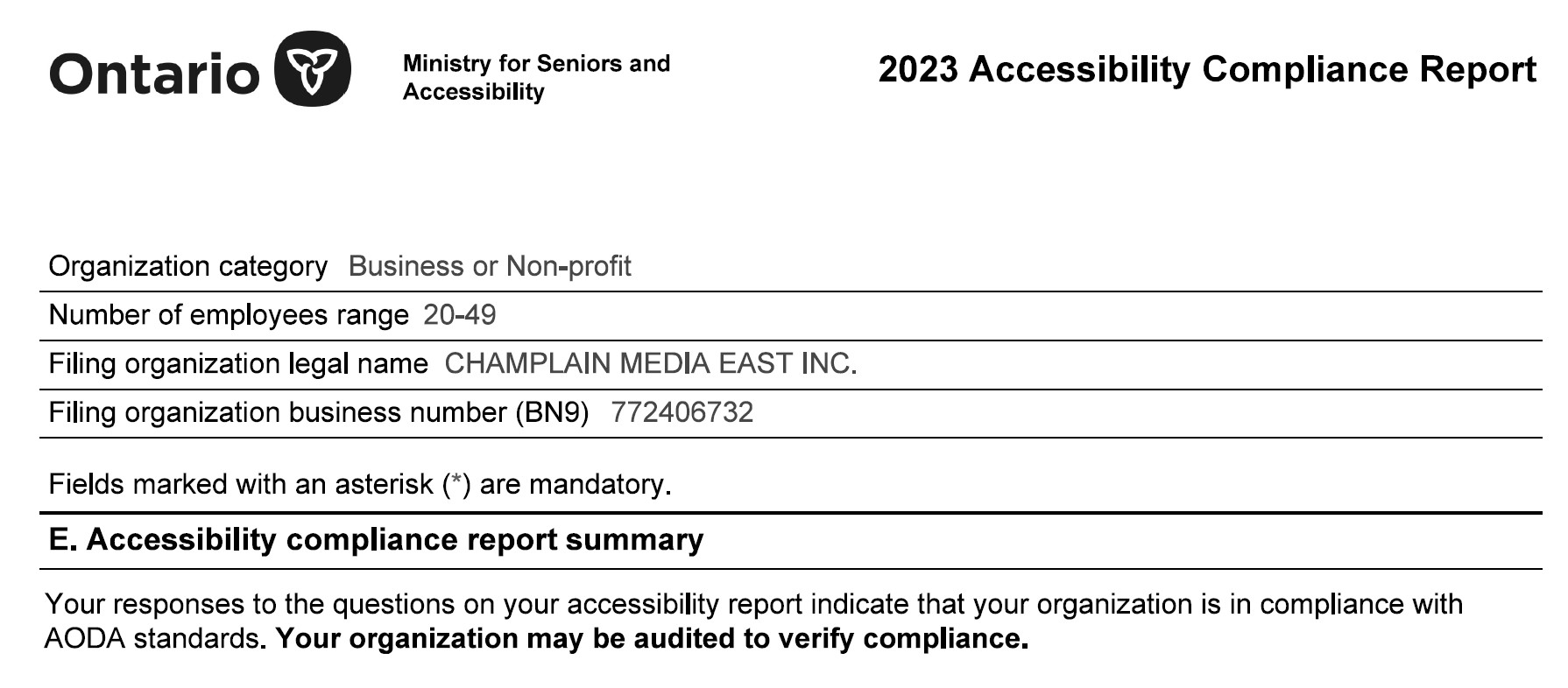 Should you have any feedback regarding our disability compliance and accommodation, please reach out to us at Legal@champlainmedia.ca and we will review it and come back to you with an accommodation plan.
